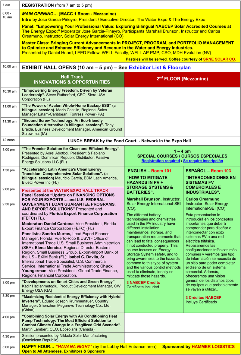 | All participants also have access to The Water Expo Agenda Organizers reserve the right to modify the program and/or substitute speakers. Speakers and/or their companies are responsible on the content of their presentations. You receive a Certificate of Attendance if you attend at least 8 educational sessions in total during the 2 expo days. (Los Organizadores se reservan el derecho de modificar el programa y/o sustituir conferencistas. Los conferencistas y/o sus compañías son responsables del contenido de sus presentaciones. Usted recibe un Certificado de Asistencia si asiste al menos a 8 sesiones en total en los 2 días de la expo) | |